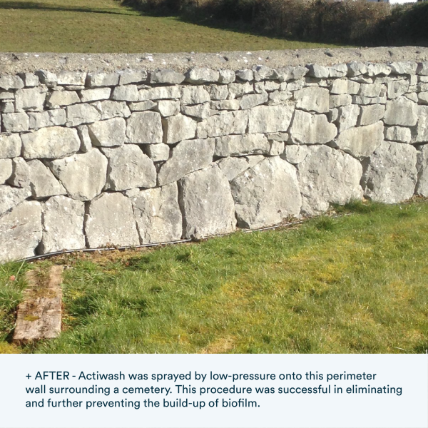 Actiwash affects the proteins and cell membrane of microorganisms, consequently causing the release of nitrogen and phosphorus from cells. Where an apply and leave application is used, the processes of natural weathering work to eliminate the dead biofilm staining.